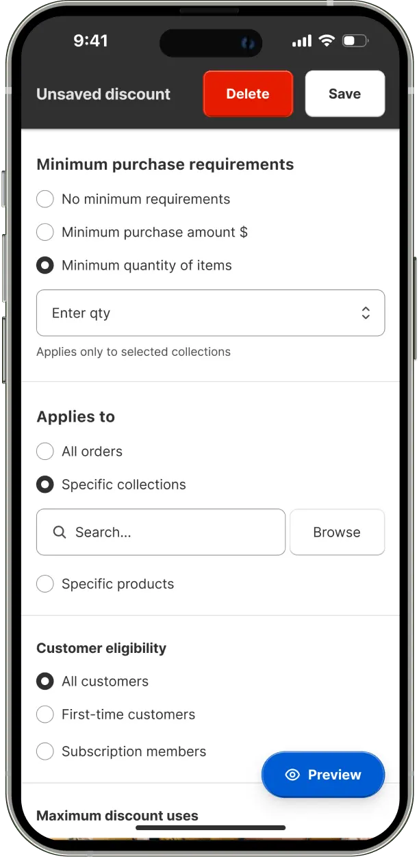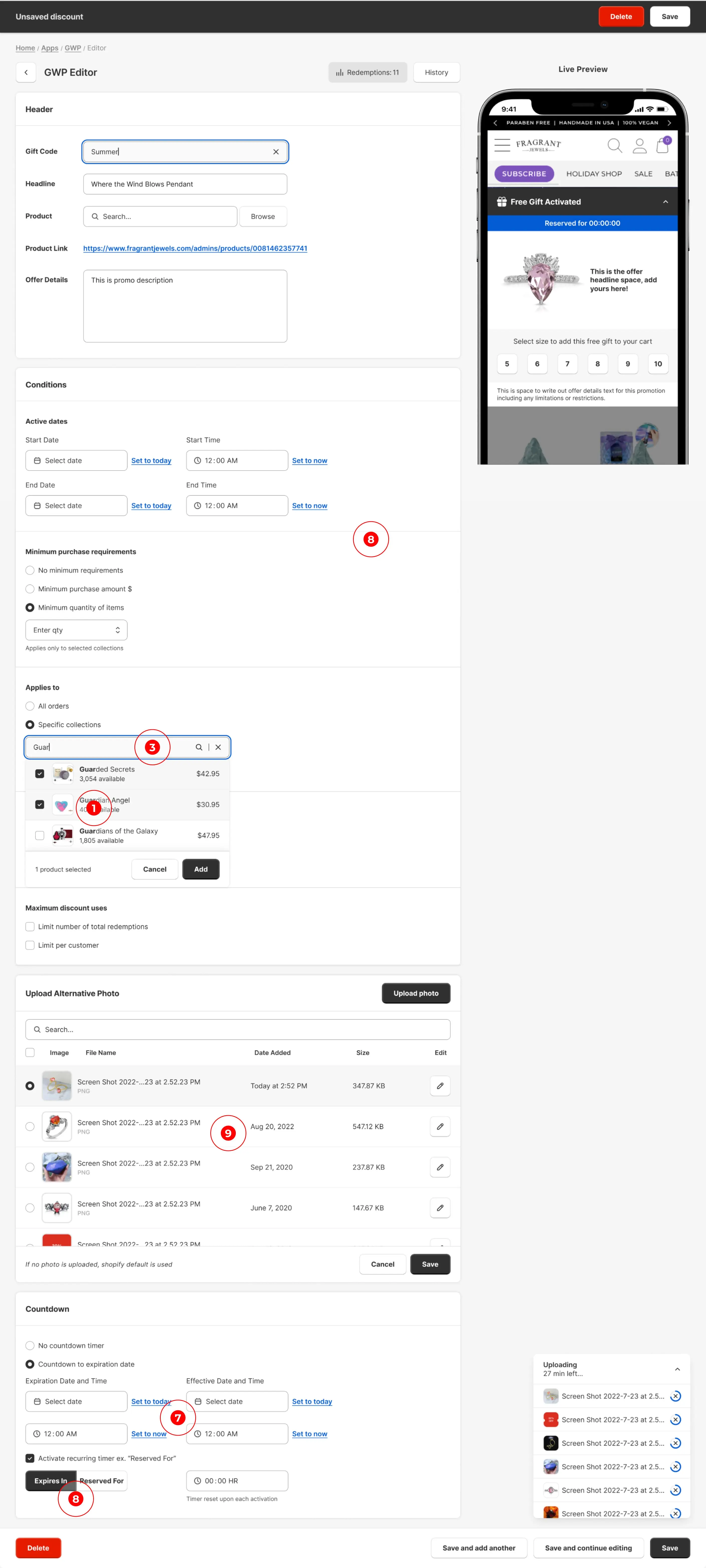 Added custom photo upload/management, customer eligibility controls, specific product/collection application, and offer/cart redemption limit settings.
