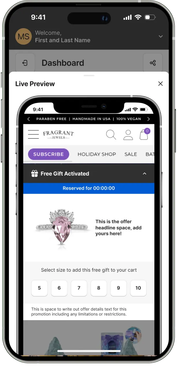 Integrated accurate offer preview with copy/image display, offer activation communication, and collapsible variant selection design.
