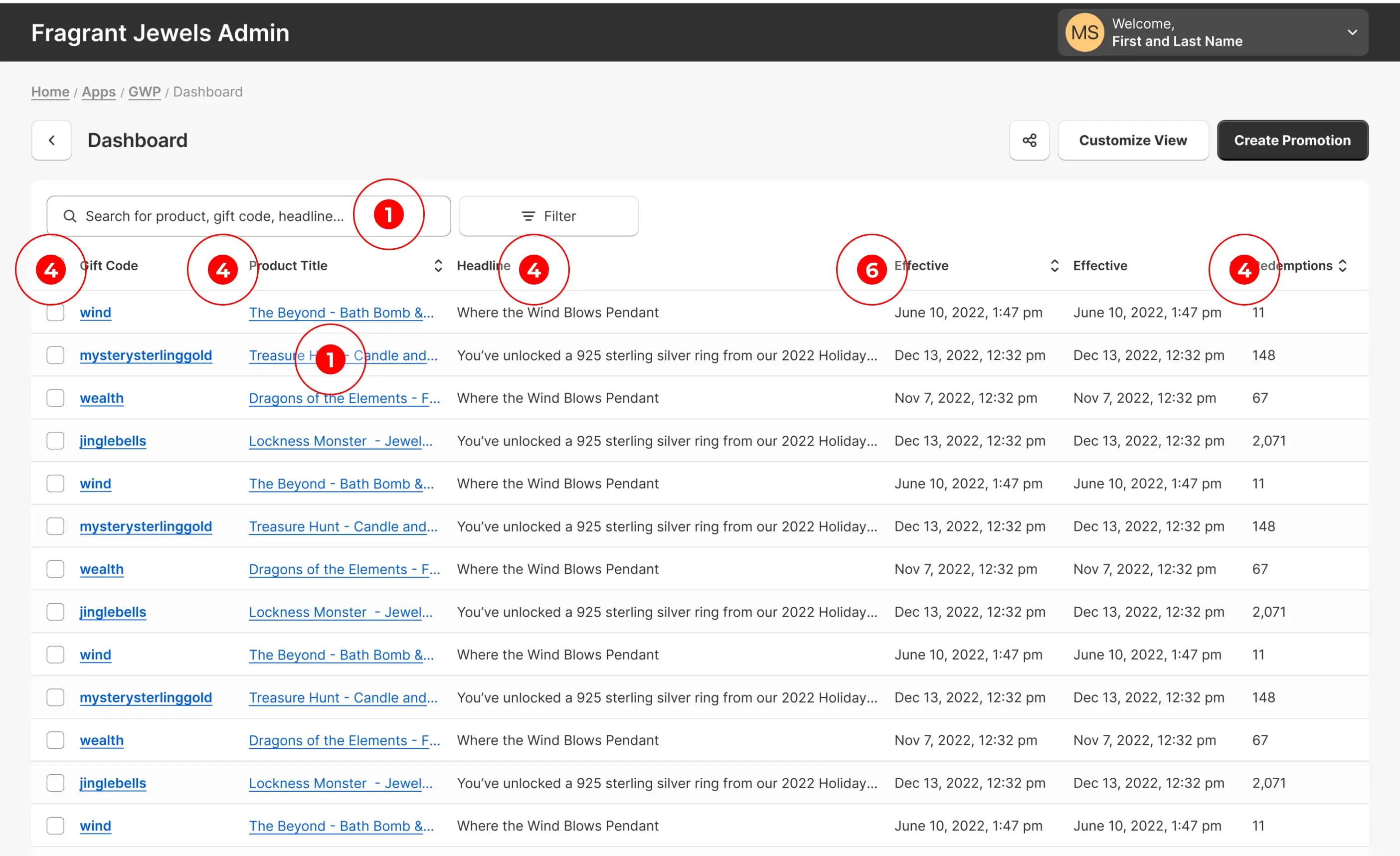 “'filter by slug' option is entirely useless to me… give me ways to sort, based on details, that actually pertain to me, like the promotion name, start and end dates, redemption counts, that kind of stuff”